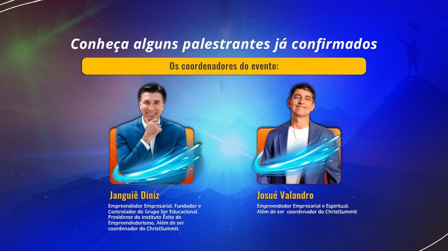 A edição inaugural do ChristSummit, programada para o Coliseu Convenções, tem a coordenação de Janguiê Diniz, empreendedor e fundador da Ser Educacional, e também presidente do Instituto Êxito de Empreendedorismo. “Defendo consistentemente que para prosperar na vida e nos negócios, é essencial aderir aos preceitos de uma vida virtuosa. A adesão a esses princípios nos aproxima de Deus, nosso Criador, resultando em Suas bênçãos para alcançarmos maior sucesso e prosperidade. No Christ Summit, discutiremos precisamente como empreender seguindo preceitos divinos, de forma a não perder nossa essência e conquistar realizações com dignidade e integridade”, afirmou Diniz. A coordenação também envolve Josué Valandro Jr., empreendedor nos âmbitos empresarial e espiritual, além de ser pastor sênior da Igreja Batista Atitude, localizada no Rio de Janeiro.